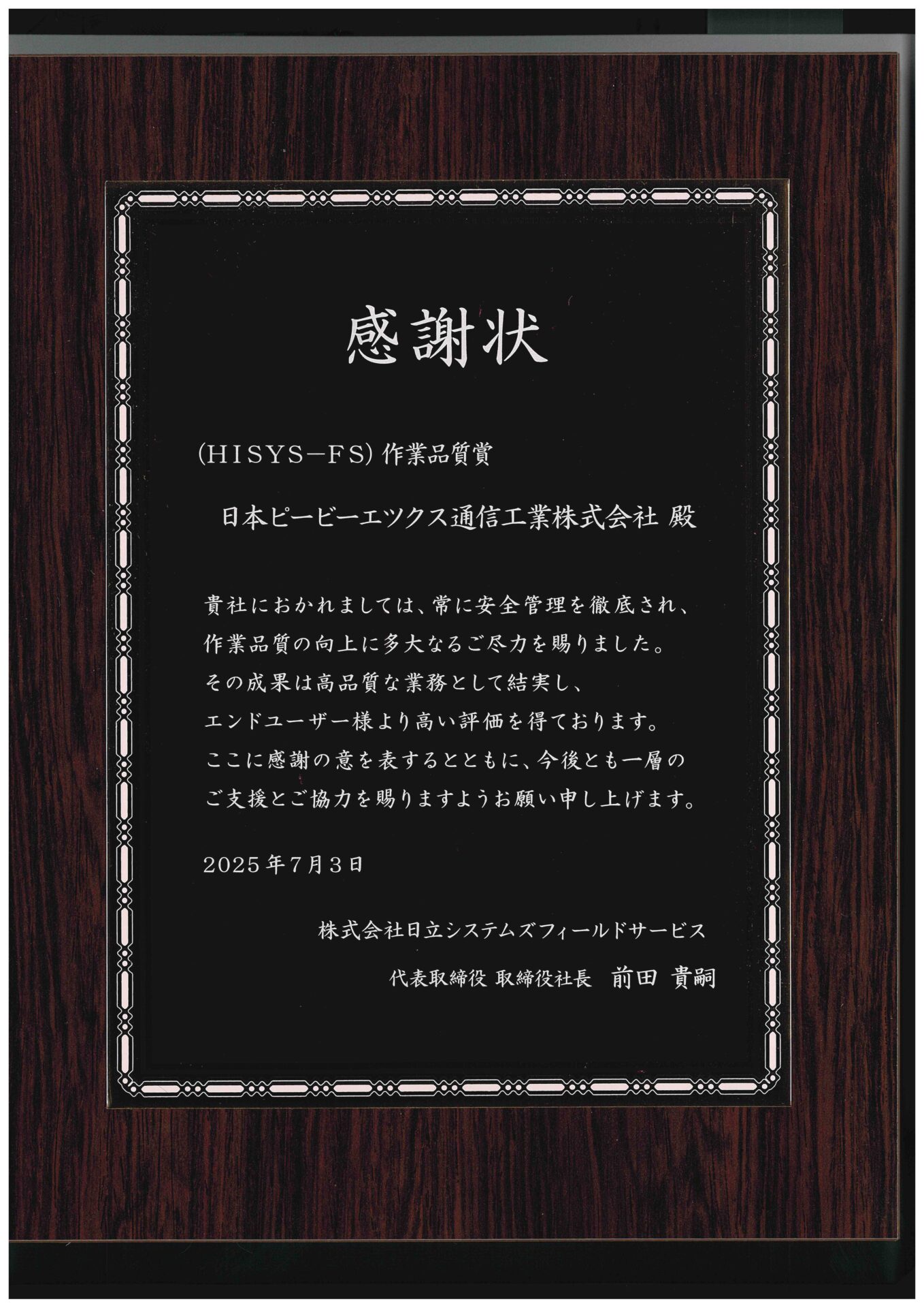 (株)日立システムズフィールドサービス様より表彰状を頂きました。
