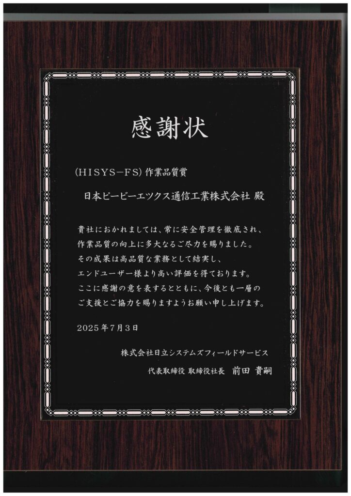 (株)日立システムズフィールドサービス様より作業品質賞を頂きました。